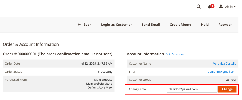 - Edición directa: Cambias el email desde la interfaz del admin (Sales -> Orders).